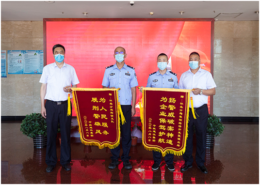 培训中心主任孔德明代表球友会(中国)官方在线登录向怀柔分局雁栖经济开发区派出所所长和怀柔分局刑侦支队支队长送上锦旗,代表公司感谢人民警察服务企业生产建设、守护一方平安付出的艰辛努力,感谢怀柔分局雁栖开发区派出所和怀柔分局刑侦支队急企业所急、想人民所想,在企业遇到困难时及时出警,有力保障了企业财产安全,维护了社会良好秩序,为企业发展创造了平安和谐的营商环境。